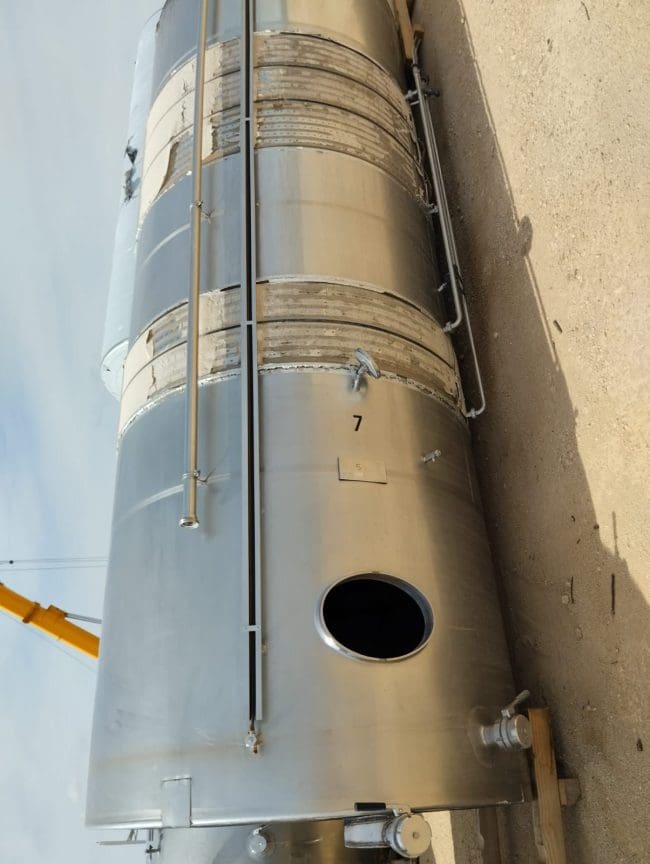 Depósitos de almacenamiento de 15.000 L de almacenamiento con camisa y fondo plano inclinado. Medidas: 2 m diámetro x 6,20 m altura.